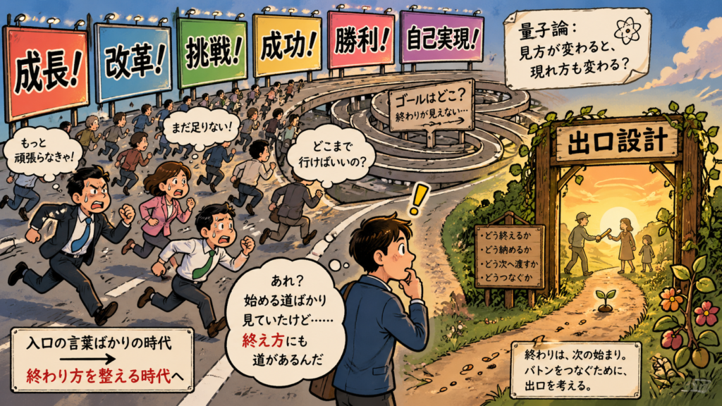 量子論では、「観測が現実を決める」といわれることがあります。これは単純に「人が見たから現実が生まれる」という意味ではありませんが、私たちの社会や生き方に大切な示唆を与えてくれます。同じ出来事でも、それを「改革」と呼ぶのか、「破壊」と呼ぶのかで、見え方は大きく変わります。現代社会は、成長、挑戦、成功、勝利といった「入口の言葉」に満ちています。けれど本当に必要なのは、「どう終えるのか」「どう納めるのか」「どう次へ渡すのか」という問いなのではないでしょうか。本稿では、「出口設計」という言葉を通じて、終わり方を整え、新しい時代を始めるための視点を考えます。