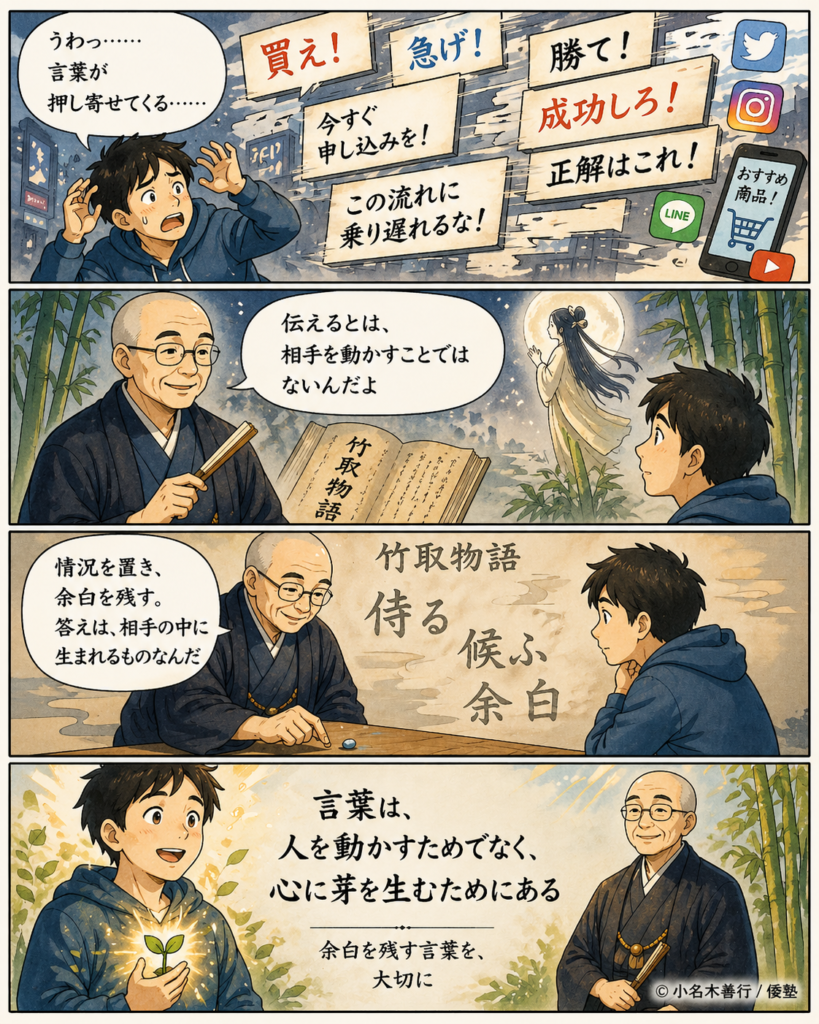 現代の言葉は、いつの間にか「相手を動かすための道具」になりつつあります。しかし日本の古文には、結論を押しつけず、情況を置き、読者の内側に答えが生まれる余白を残す姿勢がありました。竹取物語や「侍る」「候文」に込められた日本語のあり方から、本当の意味で「伝える」とは何かを考えます。