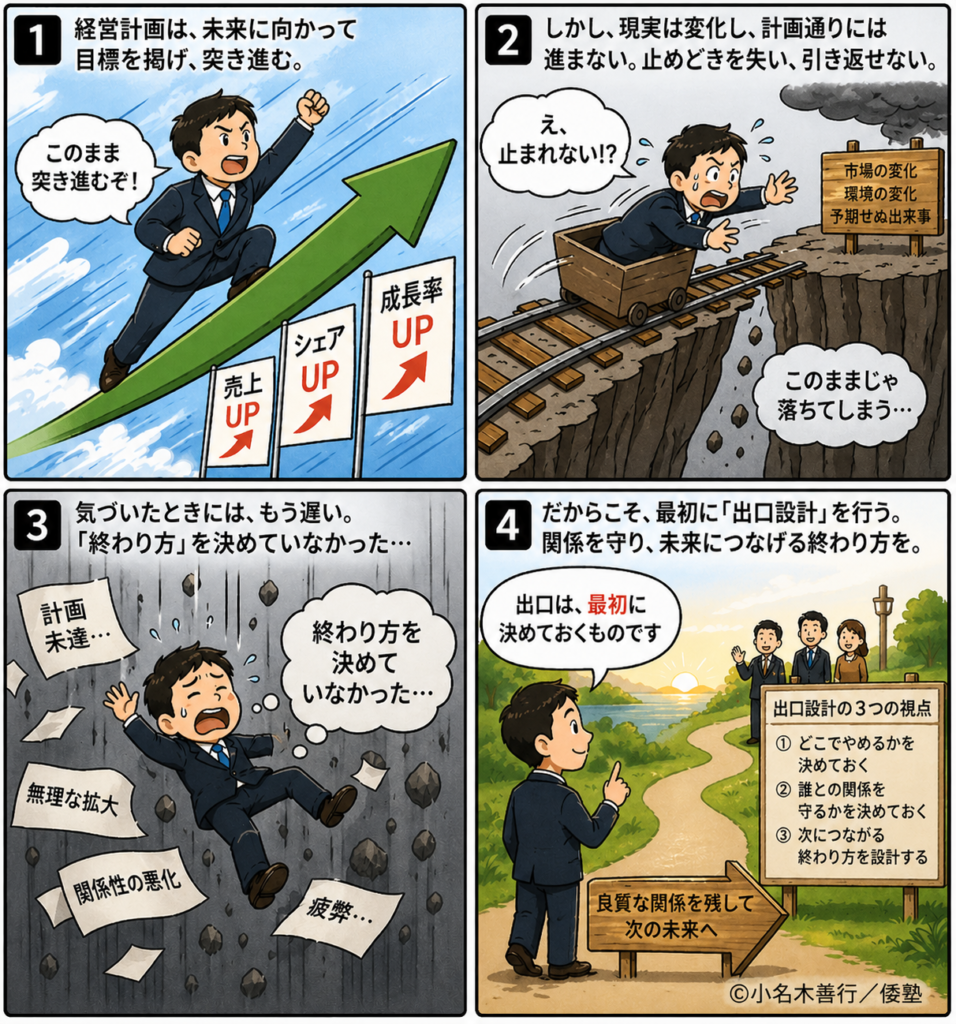 多くの企業が経営計画を立てています。しかし、その多くは思い通りには進みません。なぜでしょうか。その原因は、意外にもシンプルです。「終わり方」が設計されていないからです。本記事では、従来の経営計画とは異なる「出口設計」という視点から、壊れない組織と持続する関係のつくり方を考えます。