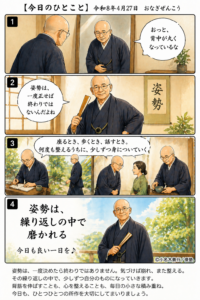 姿勢は、一度正せば終わりではありません。気づけば崩れ、また整える。その繰り返しの中で、背筋も心も少しずつ磨かれていくことを、4コマ漫画でやさしく伝えます。
